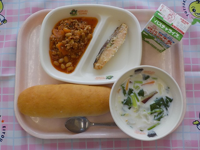 コッペパン・牛乳・鮭のムニエル・白菜のクリームスープ・大豆のトマト煮