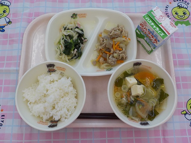 「白菜のクリームスープ」は、北栄町産の白菜、にんじん、かぶ、さつまいも、ほうれんそうを入れて作りました。旬の野菜には、その季節の体に必要な栄養素がたっぷり詰まっています。寒い日があったり、暖かい日があったりと寒暖差で体調を崩しやすい時期です。旬の野菜をしっかり食べて、元気に過ごしましょう。