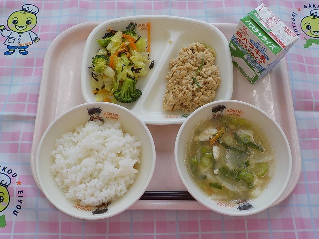 「北栄特製焼肉」は、地元女性会さん手作りの焼肉のたれを使って味付けしています。たまねぎ、にんにく、梨などの材料と調味料を合わせ、大きな鍋で煮て作られた焼肉のたれは、お肉にも野菜にもよく合います。「らっきょう入りポテトサラダ」は、北栄町産のじゃがいも、ながいも、にんじん、らっきょうが入っています。今日も地元食材たっぷりの給食を、おいしく食べてくださいね。