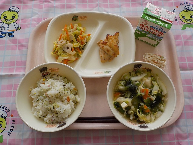 ごはん・牛乳・豆腐ちくわの磯辺揚げ・じゃぶ・キャベツのおかか和え・二十世紀梨ゼリー