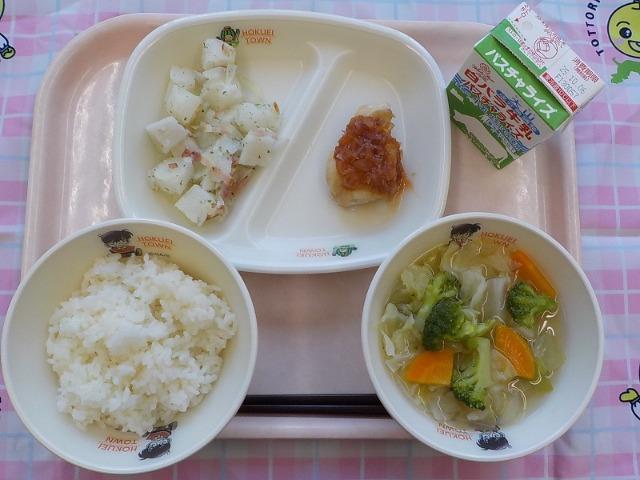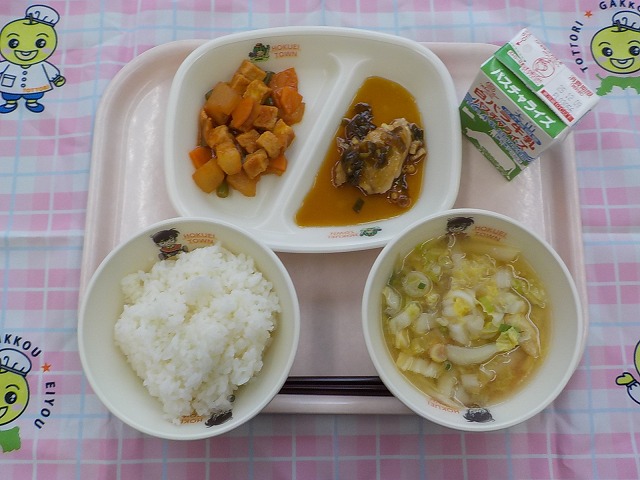 ご飯・牛乳・鶏肉のらっきょうソース・キャベツのスープ煮・ジャーマンながいも