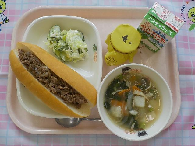北栄町産鳥取和牛を炒めてJA女性会さん手作りの焼肉のたれで味付けし、大山小麦コッペパンにはさんで食べる「焼肉ドッグ」に、北栄町の特産物であるながいもやらっきょうを使ったサラダとスープ、デザートは道の駅ほうじょうのオリジナル「梨プリン」です。食材費の一部は、県補助金を活用しながら町が負担することで特別献立を提供しています。