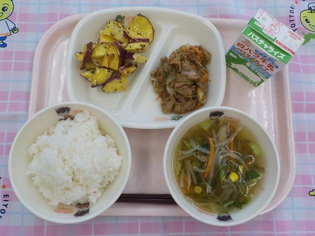 ご飯・牛乳・ホイコーロー・茎わかめのスープ・大学いも