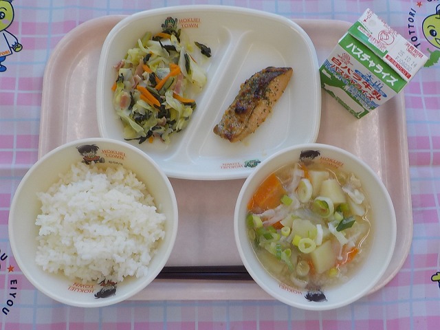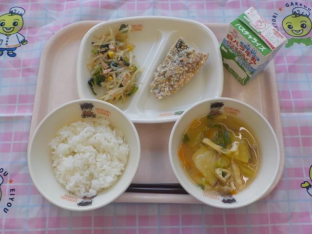 ご飯・牛乳・鮭のノンエッグマヨ焼き・豆乳みそスープ・小松菜とベーコンのソテー