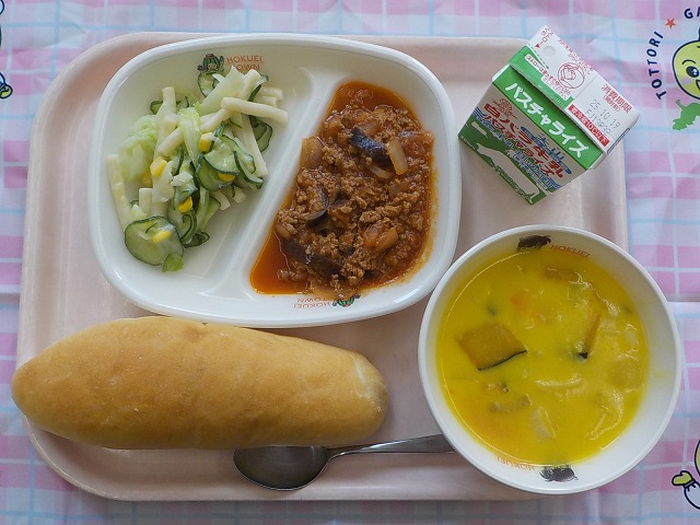 コッペパン・牛乳・ジビエとなすのトマト煮・かぼちゃポタージュ・マカロニサラダ