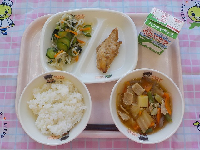 今日は、北栄町のキャベツ、こまつなを入れたツナ和えを作りました。北栄町の学校給食は、北条・大栄の給食会さんにお世話になり、地元のおいしい旬の野菜をたっぷり使って作っています。地元の恵みに感謝をしおいしくいただきましょう。