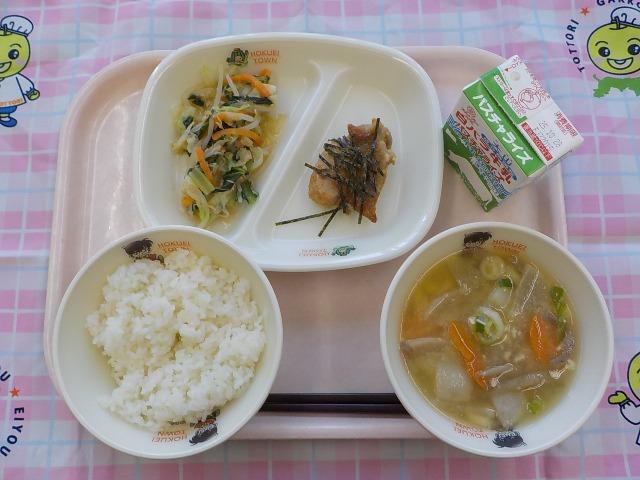 今日は「カミカミデー」です。揚げたさつまいもや、スープに入れた茎わかめはかみごたえのある食材です。よくかむことを意識して食べましょう。