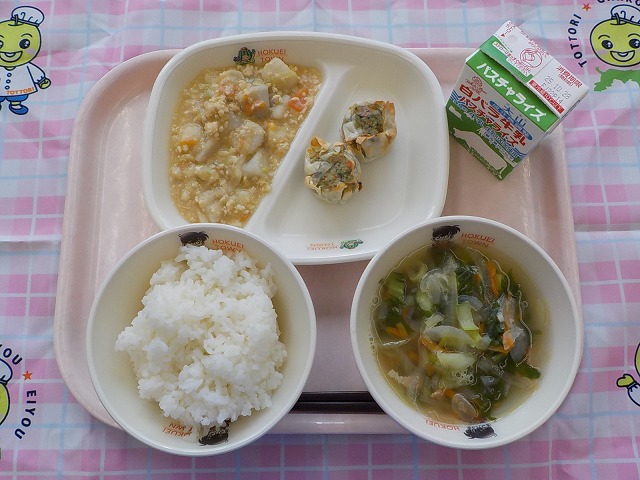 ごはん・牛乳・しゅうまい・チンゲンサイの彩りスープ・さといもの中華そぼろ煮