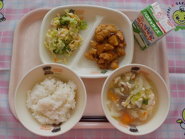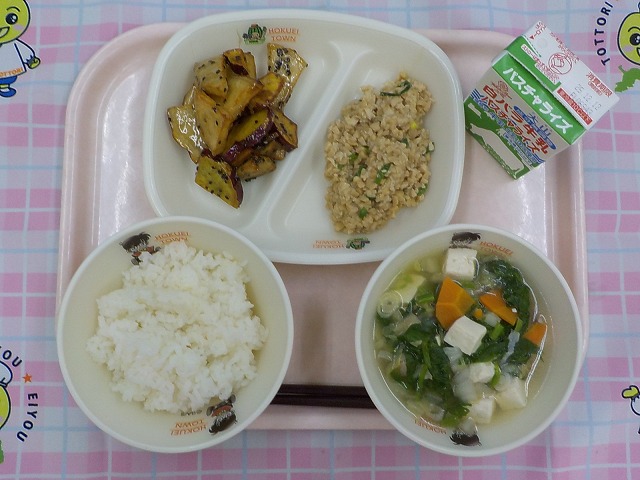 ごはん・牛乳・さつまいもと鶏肉の甘辛揚げ・北栄野菜のけんちん汁・ツナマヨらっきょうサラダ