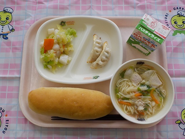 コッペパン・牛乳・焼きぎょうざ・塩ラーメン・砂丘ながいものサラダ