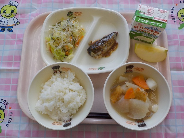 カレーには北栄町産のじゃがいも、かぼちゃ、なす、しょうが、にんにく、梨ペーストを入れました。りんごも北栄町産です。今日も地元の食材たっぷりの給食を味わいましょう!