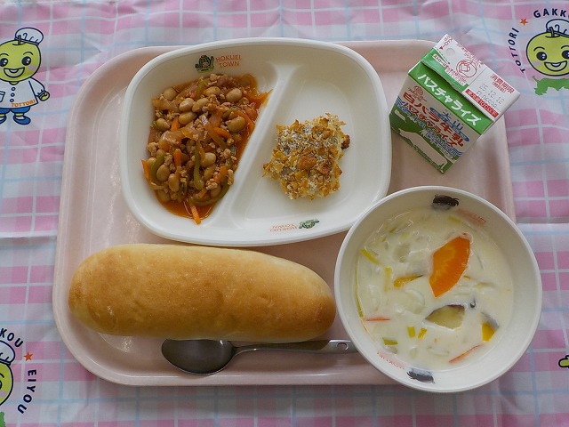 コッペパン・牛乳・たらのフレーク焼き・かぼちゃのシチュー・大豆のトマト煮