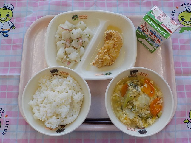 ごはん・牛乳・ささみのレモンソースかけ・ブロッコリーとたまごのスープ・ジャーマンながいも