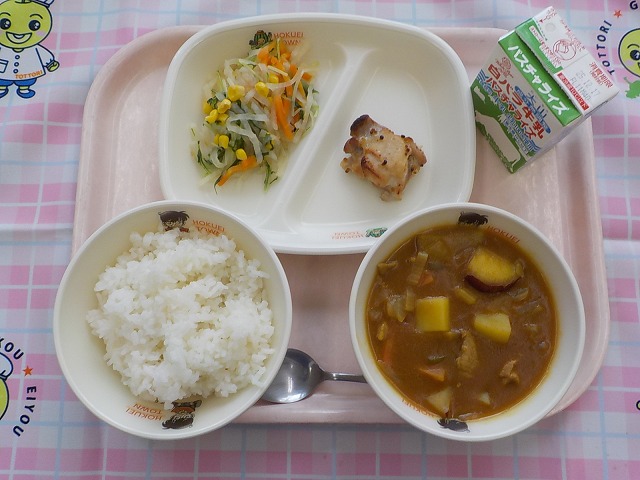 ご飯・牛乳・白身魚のパン粉焼き・秋の実りカレー・水菜のサラダ