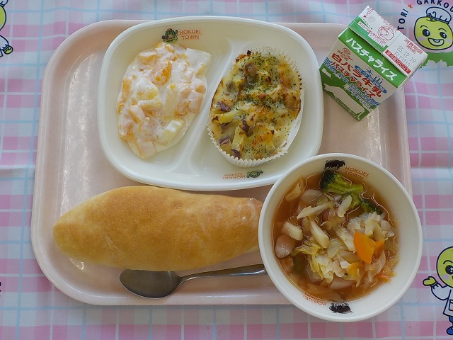 今日の「いもいもグラタン」には、北栄町産のながいもとさつまいもの2種類のいもを使っています。いもの他にも、白ねぎ、にんじん、タラも入れた、具だくさんのグラタンです。「冬野菜のミネストローネ」には、かぶ、キャベツ、にんじん、ブロッコリーを使っています。今日も旬の食材たっぷりの給食を、おいしくいただきましょう。