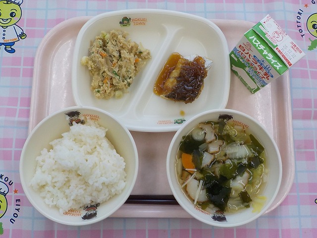 今日は「おむすびさんちのたうえのひ」(かがくいひろし 作・絵)にちなんで、自分でおむすびを作って食べられるおむすびのりをつけました。おむすびさんちの田植えの一日を描いたお話で、ユニークな村の仲間が手伝いに来てくれます。新米の季節になり、給食でも北栄町産の新米を使ったごはんを出しています。お米のおいしさ、農家の方々への感謝の気持ちを改めて感じる機会にしてほしいと思います。