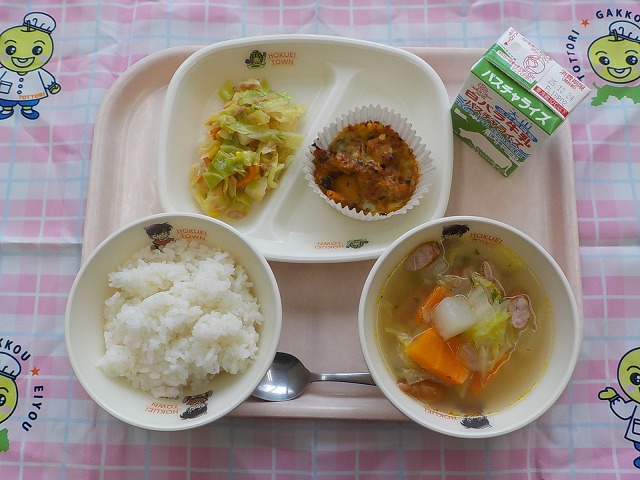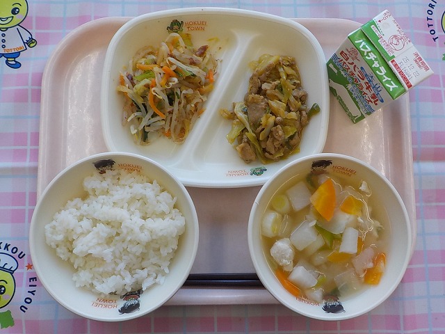 毎月1日は「いいね!北栄給食の日」として、北栄町の特産物や地元産の食材をたっぷり使った献立にしています。今日の給食に使用した野菜、いも、きのこはすべて北栄町産です。地元の豊かな恵みと生産者のみなさんに感謝して、おいしくいただきましょう。