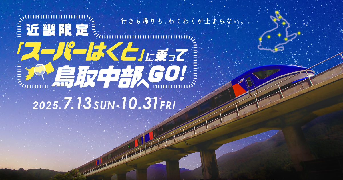 期間中、特急スーパーはくとを利用し鳥取中部に来られた近畿地方在住者限定で、デジタルアンケートへの回答と特急券をアップロードして応募された方へ抽選で合計100名様に北栄町を含む鳥取中部の特産品が当たるキャンペーンを実施します!