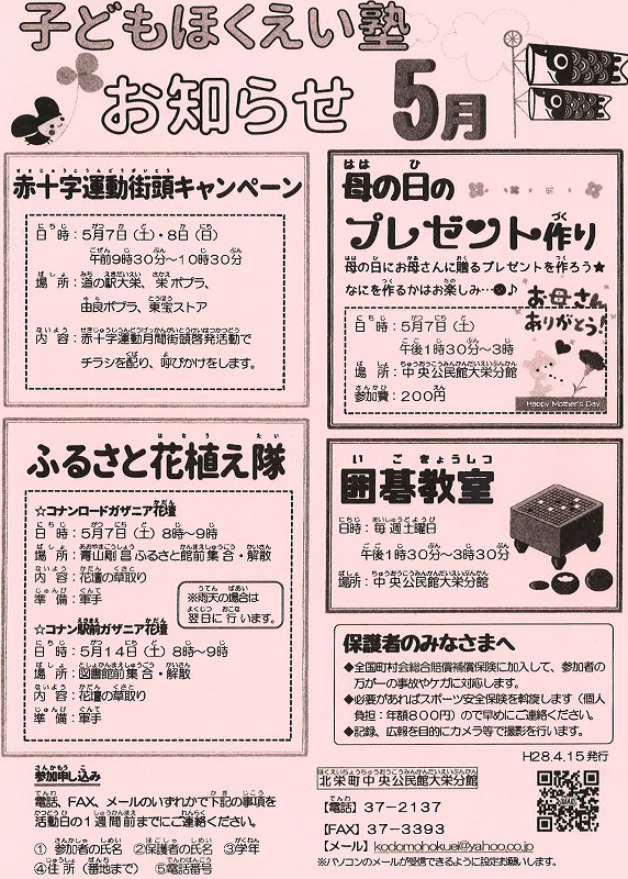 中央公民館大栄分館では、次のとおり「子どもほくえい塾~5月~」を開催します。