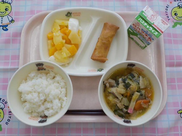 ごはん・牛乳・春巻・八宝菜・杏仁フルーツ