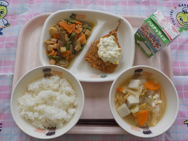 今日は、鳥取県産のあじを使いさくさくの衣のあじフライを作りました。女性会さんが作られた甘酢漬けを入れたタルタルソースとの相性も抜群です。あじには成長期のみなさんに欠かせない栄養素が豊富なので、しっかり食べて健康な体を作りましょう。