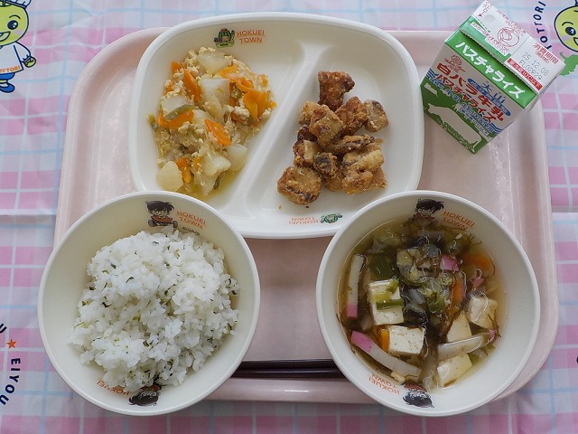 今日は「おむすびさんちのたうえのひ」(かがくいひろし 作・絵)にちなんで、自分でおむすびを作って食べられるおむすびのりをつけました。おむすびさんちの田植えの一日を描いたお話で、ユニークな村の仲間が手伝いに来てくれます。新米の季節になり、給食でも北栄町産の新米を使ったごはんを出しています。お米のおいしさ、農家の方々への感謝の気持ちを改めて感じる機会にしてほしいと思います。