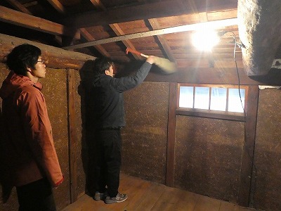 天井裏の床面に透湿防水シートを敷いていて隙間をテープでふさぎます。 天井の下にある部屋からの湿気を天井に逃がし、天井からの入る湿気を防ぎます。
