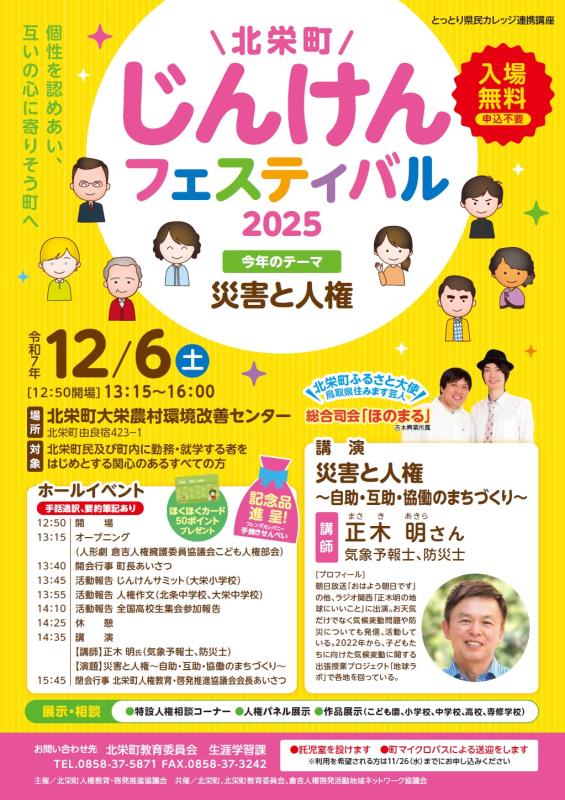 さまざまな人権問題についての認識を深め、人権を身近に感じていただくことにより、人権意識の高揚を図り、差別や偏見、人権侵害のない住みよいまちづくりを推進することを目的に、北栄町じんけんフェスティバル2025を開催します。