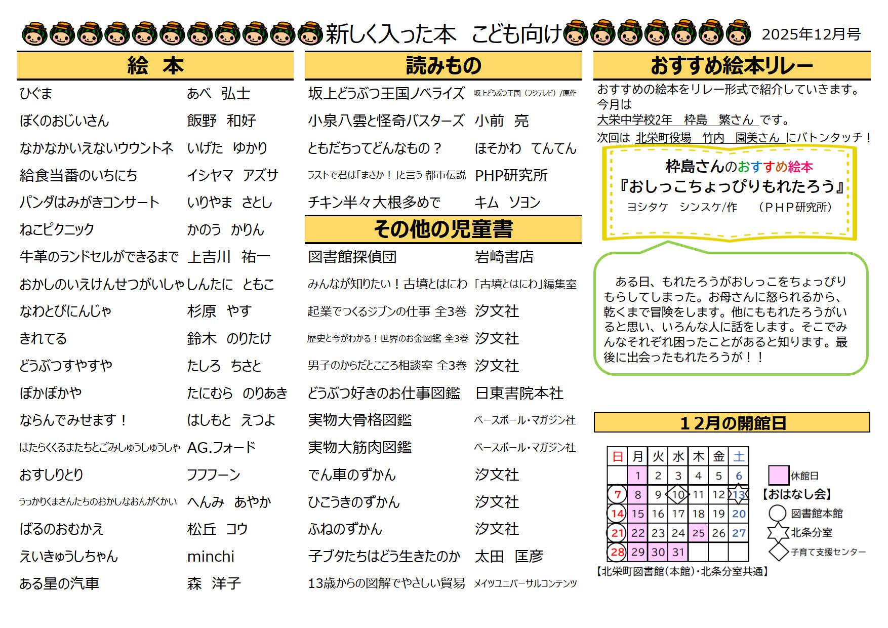 「新しく入った本 こども向け」には、「おすすめ絵本リレー」を載せています。