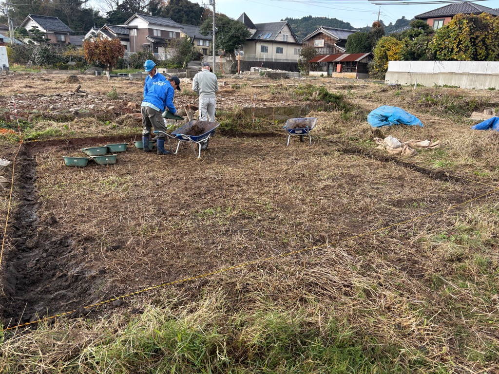 この写真は草を刈った後に掘り始めたところね、人の力で掘るわ。