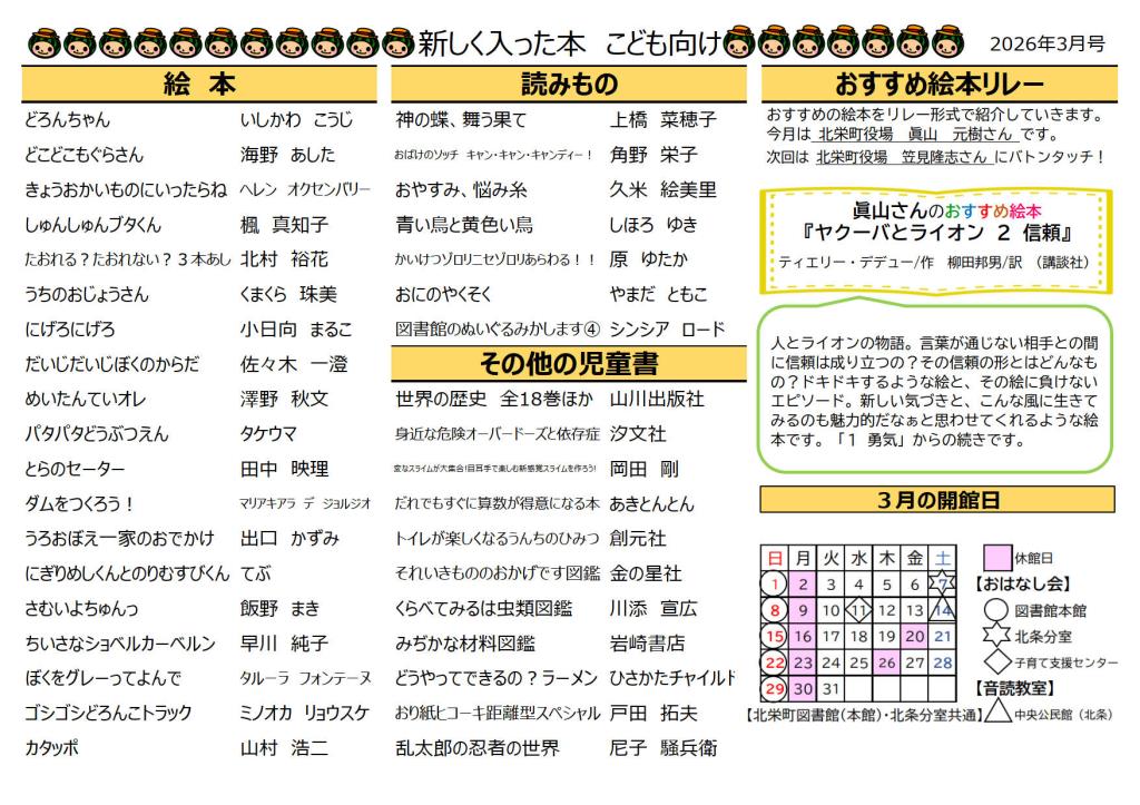 「新しく入った本 こども向け」には、「おすすめ絵本リレー」を載せています。