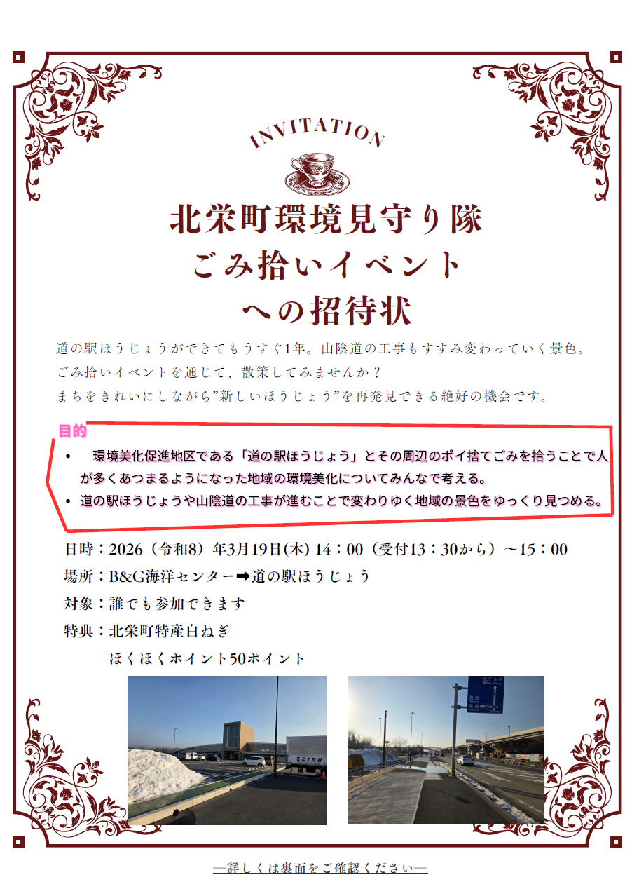 詳しくは北栄町環境見守り隊ごみ拾いイベントへの招待状をご覧ください。